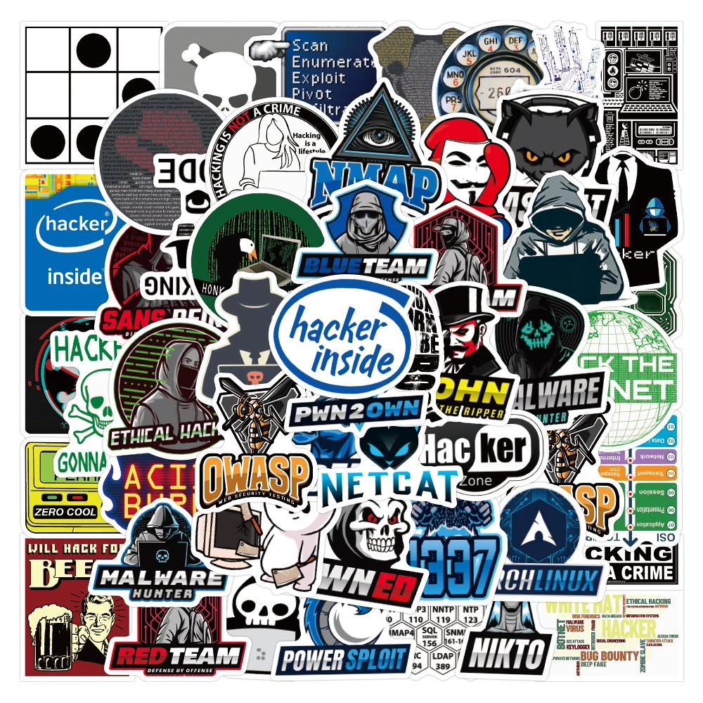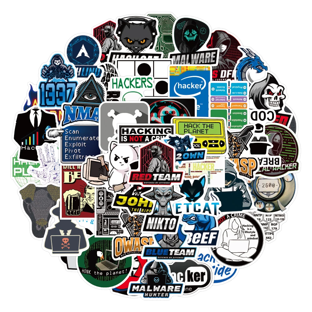 This is a randomized collection of IT and Cyber Security related stickers, the stickers contain logo's and various designs of Red and Blue team tools such as: